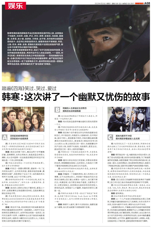 日前,韩寒导演接受媒体专访,阐述了关于《四海》的创作故事,从创作缘起到角色塑造,再到作品中注入的生活感悟,一一道来。对于《四海》,韩寒坦言在角色之中有自我投射——而他的幽默与忧伤,也像《四海》中关于故乡与他乡的铺陈那样,被严密地区隔开却又出奇地统一在了这部电影之中。最终带给观众的是一部既会爆笑也会流泪,有笑有痛的关于“爱与孤独”的电影。