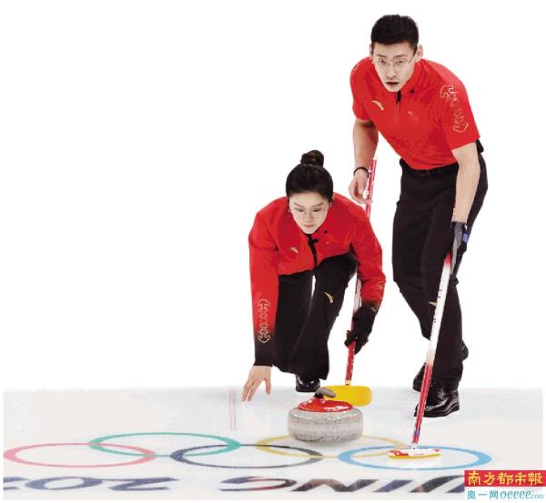 昨晚,中国冰壶混双组合凌智/范苏圆正在比赛。 南都记者 黎湛均 摄