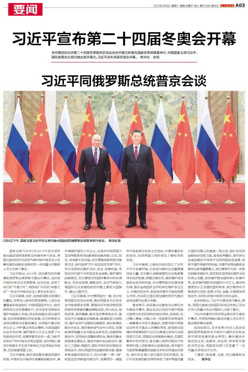 2月4日下午,国家主席习近平在北京钓鱼台国宾馆同俄罗斯总统普京举行会谈。 新华社发 国家主席习近平2月4日下午在北京钓鱼台国宾馆同俄罗斯总统普京举行会谈。两国元首在热烈