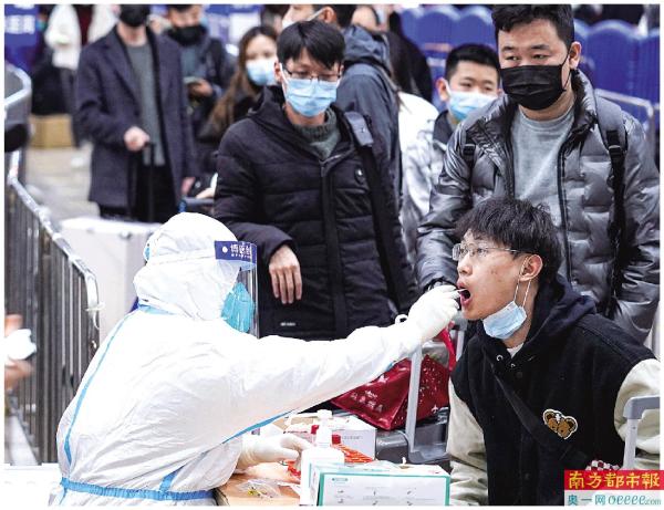 前日,抵穗旅客在广州南站内接受核酸检测。 南都记者 吴泽嘉 摄