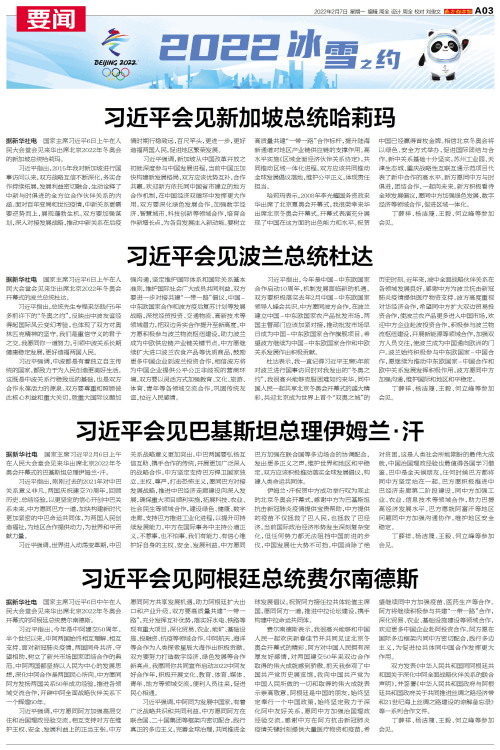 据新华社电 国家主席习近平6日上午在人民大会堂会见来华出席北京2022年冬奥会的新加坡总统哈莉玛。 习近平指出,2015年我对新加坡进行国事访问以来,双方战略互信不断深化,务实合作持续拓展,发展