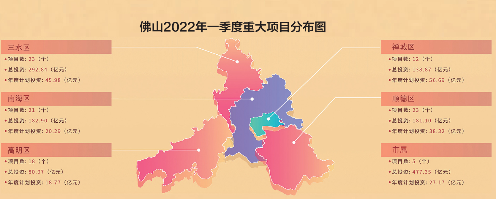 今年一季度,佛山安排集中开工重大项目102项,总投资1354.03亿元,年度计划投资207.22亿元。