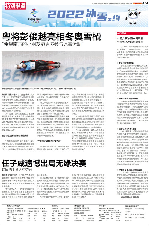 今日看点 2月10日,北京冬奥赛场将有8金产生,其中又一个混合团体项目——自由式滑雪空中技巧混合团体将会完成冬奥会首秀,中国队有望成为这个新设小项的首个奥运冠军。◎女子冰壶拉开战幕 上午9时0