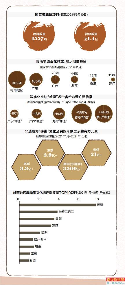 而按照视频播放量排行,岭南地区最热门的非遗项目依次为潮剧、壮族三月三、粤剧、凉茶、琼剧、儋州调声、粤曲、雷剧、彩调。