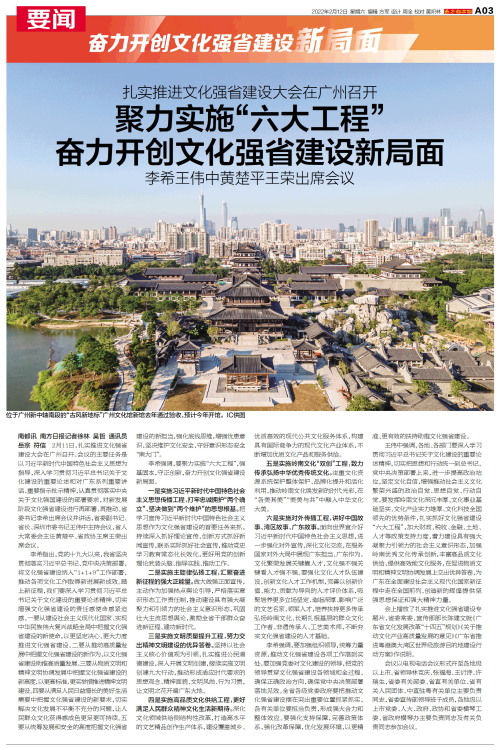 南都讯 南方日报记者徐林 吴哲 通讯员岳宗 符信 2月11日,扎实推进文化强省建设大会在广州召开。会议的主要任务是以习近平新时代中国特色社会主义思想为指导,深入学习贯彻习近平总书记关于文化建设的重