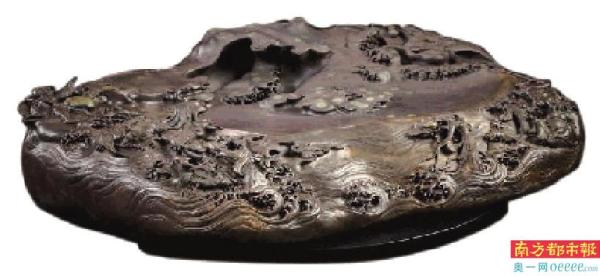 杨焯忠还擅长用端砚雕刻历史故事,他认为,雕刻端砚需要人文内涵,更需要用心。他的代表作之一《夜半钟声到客船》,就利用砚石上原有的弧形的火捺作为桥梁,以端堂中心凸起的猪肝冻为客船,稍加雕刻,让人如临夜泊羁旅之境。