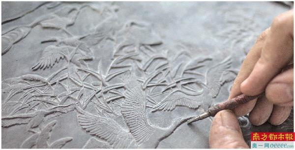杨焯忠在长年累月的雕刻实践中,总结出一套独特的杨氏刀法,名为“斜口刀雕砚技艺”,斜口雕刻能让刀锋运转灵活自如,雕刻出来的线条流畅厚重,图案凹凸有度,更为生动。