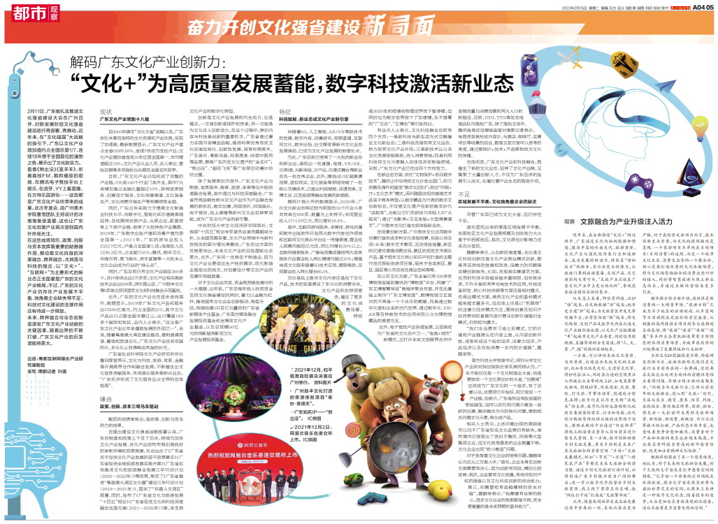 2月11日,广东省扎实推进文化强省建设大会在广州召开,对新发展阶段文化强省建设进行再部署、再推动。近年来,在“文化强国”大战略的指引下,广东以文化产业增加值约占全国总量1/7、连续18年居于全国首