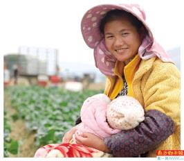 在这片菜地里,我们看见有背着孩子择菜的父母;也看见年轻的爸爸熟练地在菜筐上为宝宝换尿片,菜筐上叠着厚厚的被褥;还看见随时哄娃喂奶的妈妈。他们每到丰收的时候,便以菜田为家。