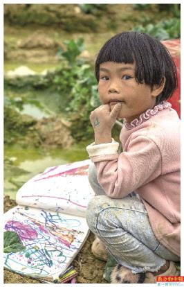 一群孩子在菜地里嬉戏玩闹,有的在本子上胡乱地画着画,有的在泥土里打着滚,浑身上下都是土。俏皮的姐姐在弟弟脸上画了一个“王”,弟弟就像一只小老虎,乐呵呵地趴在地上。接着姐姐还给他画上了眉毛和胡子,周遭的孩子们因为这个创意开心不已。