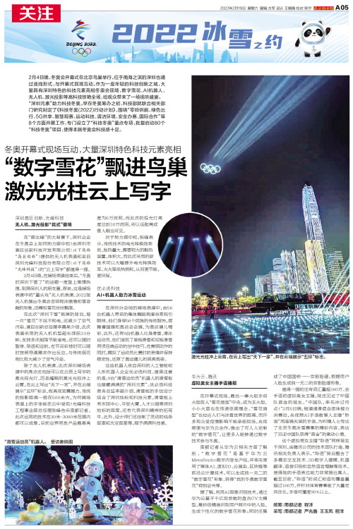 2月4日晚,冬奥会开幕式在北京鸟巢举行。位于南海之滨的深圳也通过连线形式,与开幕式现场互动。作为一座年轻的科技创新之城,大量具有深圳特色的科技元素亮相冬奥会现场,数字雪花、AI机器人、无人机、激光