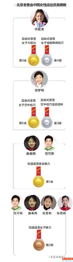 1992年,中国运动员在冬奥会上第一次斩获奖牌,自那以来,从1992年至2018年共九届冬奥会,其中有八届中国女性运动员的奖牌数多于男性。在本届北京冬奥会上,我国女运动员占比高达49.43%,截至2月15日,谷爱凌获得个人金牌和银牌,徐梦桃获得个人金牌和团体银牌,曲春雨、张雨婷、范可新获得短道速滑混合接力的团体金牌,由范可新、曲春雨、张楚桐、张雨婷组成的中国短道速滑女队获得团体铜牌,此外,荣格在单板滑雪女子大跳台决赛中取得中国选手在该项目上的最好成绩。