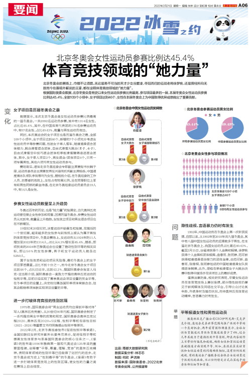 北京冬奥会的赛场上,巾帼不让须眉。无论是势不可当的天才少女谷爱凌,夺冠而归的征战老将徐梦桃,还是曾经所向无敌而今在赛场外解说的王濛,都在诠释体育竞技领域的“她力量”。 根据国际奥委会数据,北京冬