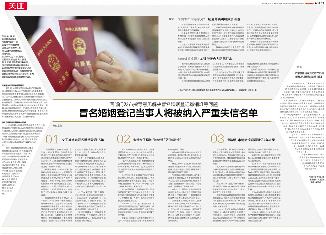 现实中,因冒名顶替或者弄虚作假等“骗婚”“被结婚”产生的婚姻登记争议时有发生,成为人民群众急难愁盼的突出问题。 2021年12月31日,最高人民检察院联合最高人民法院、公安部、民政部制定并发布《