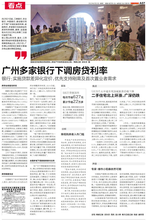 自2月21日起,工商银行、农业银行、中国银行、建设银行同步下调广州地区房贷利率。紧随其后,多家银行也陆续宣布房贷利率调整。据悉,这是国有大行2022年以来第二次进行房贷下调。 继上周山东菏泽、重