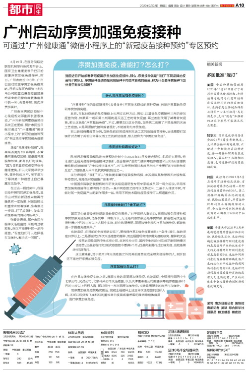 2月19日,在国务院联防联控机制举行新闻发布会上,国家卫生健康委表示已开始部署序贯加强免疫接种。昨日,广州市疾控中心称,广州已启动实施序贯加强免疫策略,目标人群可选择智飞龙科马公司的重组蛋白疫苗或