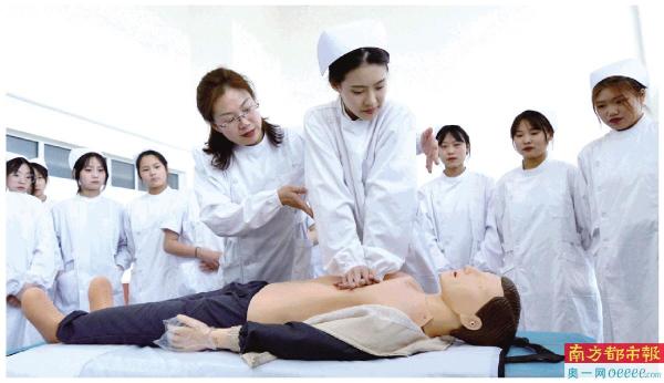 2021年4月19日,河北省邯郸职教城老师指导学生进行护理实践操作。 新华社发