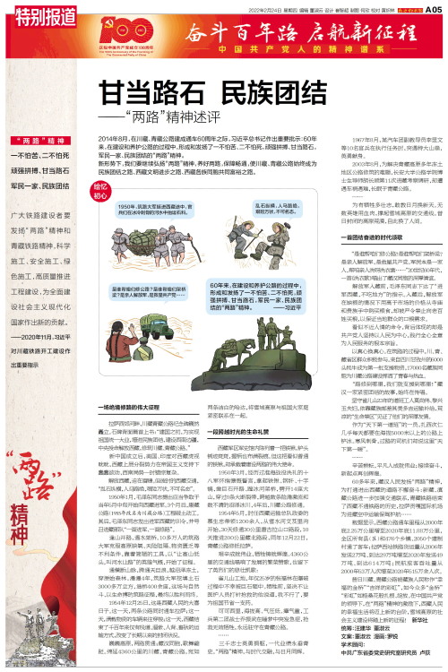 “两路”精神一不怕苦、二不怕死顽强拼搏、甘当路石军民一家、民族团结广大铁路建设者要发扬“两路”精神和青藏铁路精神,科学施工、安全施工、绿色施工,高质量推进工程建设,为全面建设社会主义现代化国家作出