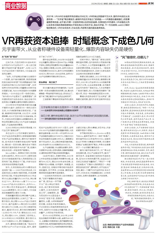 元宇宙概念的催化也是其中一个因素,但不是关键。——北京视界方舟科技有限公司董事长初树平 缺芯少屏、硬件体验感仍欠缺、缺乏行业平台等都是制约其发展的因素。——深圳虚拟现实行业协会会长雷鸣 202