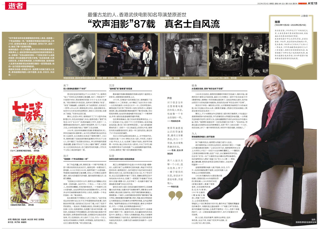 年轻时的楚原。图源香港电影金像奖官微 《流星·蝴蝶·剑》剧照。 资料图 《黑玫瑰》剧照。 资料图 《可怜天下父母心》剧