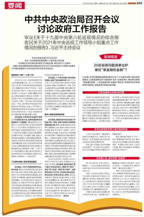中共中央政治局2月25日召开会议,讨论国务院拟提请第十三届全国人民代表大会第五次会议审议的《政府工作报告》稿,审议《关于十九届中央第八轮巡视情况的综合报告》和《关于2021年中央巡视工作领导小组重