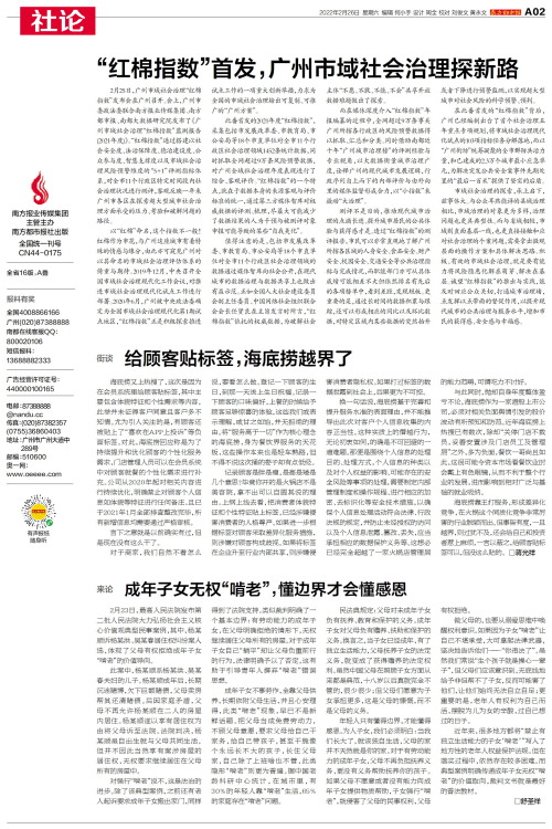 2月25日,广州市域社会治理“红棉指数”发布会在广州召开。会上,广州市委政法委联合南方报业传媒集团、南方都市报、南都大数据研究院发布了《广州市域社会治理“红棉指数”监测报告(2021年度)》。“红