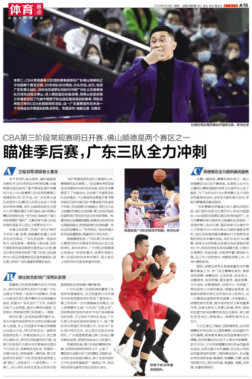 本周二,CBA常规赛第三阶段的赛事就将在广东佛山顺德和辽宁沈阳两个赛区打响,20支球队兵分两组,分头作战。近日,包括广东东莞大益队、深圳马可波罗队和时代中国广州队三支南粤球队已经先后抵达佛山,进入