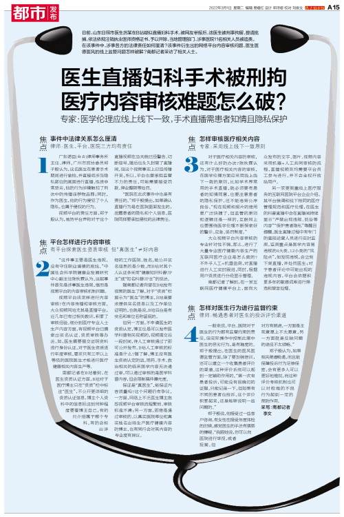对于医疗相关内容的审核,还有什么好的办法?陈秋霖认为,对于医疗相关内容的审核,在医学伦理方面应采用线上线下一致的原则,比如学术界常用的手术直播,就必须要有患者的知情同意,也要注意患者的隐私保护,还不能违背公序良俗。“现在视频和照片的使用更广泛快捷了,但监管的原则和逻辑还是一样的,互联网上也要围绕医学伦理不断探索好的警示、应急、惩罚制度。”