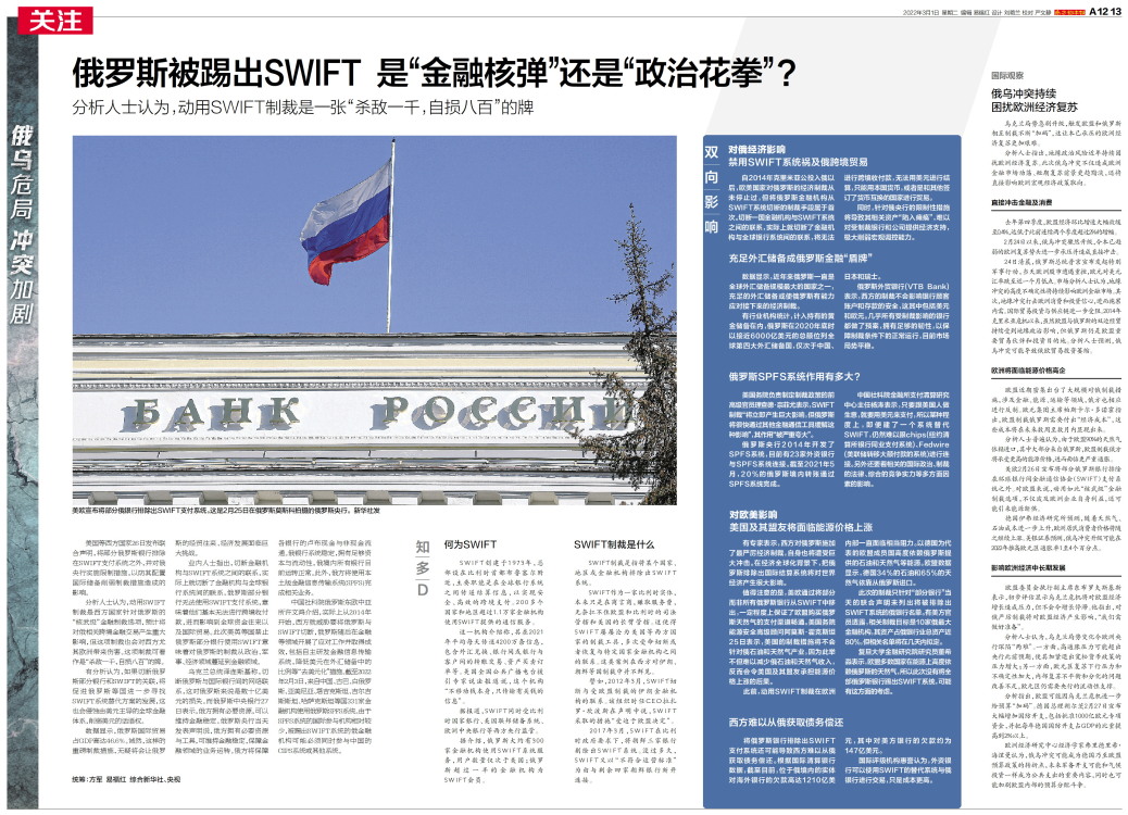 美国等西方国家26日发布联合声明,将部分俄罗斯银行排除在SWIFT支付系统之外,并对俄央行实施限制措施,以防其配置国际储备削弱制裁措施造成的影响。 分析人士认为,动用SWIFT制裁是西方国家针对