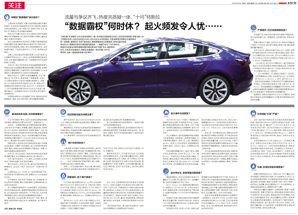 上海车展“车顶维权”女车主起诉特斯拉一案,去年底在河南安阳北关区人民法院开庭审理,距离当事人站上特斯拉车顶,已经过去足足249日。此次长达大半年的维权,只是消费者对特斯拉大量质疑中的一段缩影。被指刹车“失灵”是否成立、事故数据是否已完整提供、软件功能为何频频出BUG、频繁召回是否代表质量问题频发……南都汽车以“十问”的形式,继续关注这家全年都伴随着流量热度和争议的“双面”车企。智能电动时代,汽车技术加速迭代,特斯拉所遭遇的一系列问题,对于业界而言,也是一面极具参考意义的“镜子”。