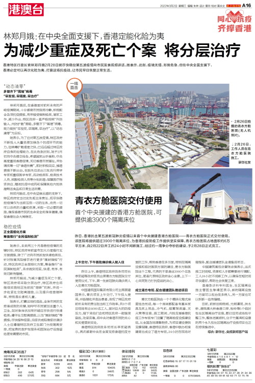 香港特区行政长官林郑月娥2月28日就尽快稳控第五波疫情向市民发表视频讲话。她表示,此刻,疫境无情、形势危急,但在中央全面支援下,香港必定可以再次化险为夷,打赢这场抗疫战,让市民早日恢复正常生活。