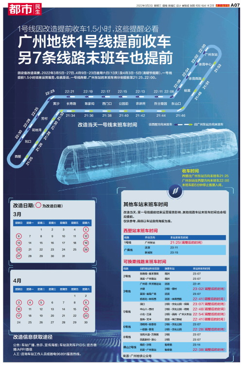 因设备改造需要,2022年3月5日-27日、4月9日-23日逢周六日(13天)及4月3日-5日(清明节假期),一号线提前1.5小时结束运营服务。也就是说,一号线西塱、广州东站的末班