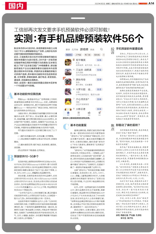 新买来内存64G的手机,系统预装软件就已占用16G?不少人都曾被那些出厂自带、占用手机内存还删不掉的系统预装软件困扰过。近日,工信部再次发文拟针对移动智能终端的应用软件预置行为进行规范。《关于进一