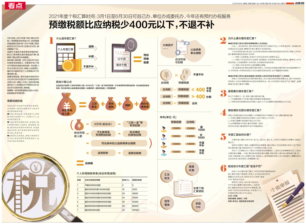 3月1日起,2021年度个税汇算正式开始。个税再度迎来多退少补,快来看看你是退税还是补税?2021年度汇算的时间为2022年3月1日至6月30日,期间跨度4个月。 为提升大家的办税效率和申报体验