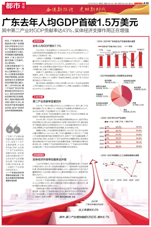 2021年广东GDP超12万亿元 比上年增长8.0% 其中,第二产业增加值超5万亿元,增长8.7% 昨日,广东省统计局、国家统计局广东调查总队共同发布《2021年广东省国民经济和社会发展统计