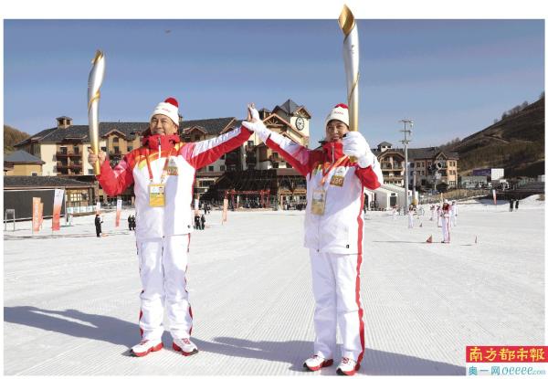 3月3日,火炬手辛俊春(左)与沈秀玲进行火炬传递。当日,北京冬残奥会火炬在河北张家口崇礼太舞滑雪场传递。新华社发