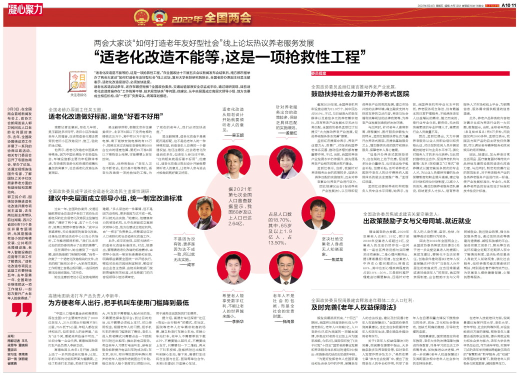 关注老龄化 “适老化改造是不能等的,这是一项抢救性工程。”在全国政协十三届五次会议新闻发布会结束后,南方都市报举办了两会大家谈“如何打造老年友好型社会”线上论坛,复旦大学老龄研究院院长、全国老龄