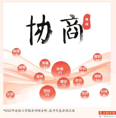 梳理发现,“协商”“建设”“发展”“政治”等均是近年来全国政协常委会工作报告里的常见热词。其中,“协商”蝉联核心热词,在2022年报告中出现41次,10年累计出现了626次,是出现最多的热词。报告提出,2022年,持续深化专门协商机构建设。努力在完善协商内容、丰富协商形式、健全协商规则、培育协商文化、提高协商能力上有新进步。