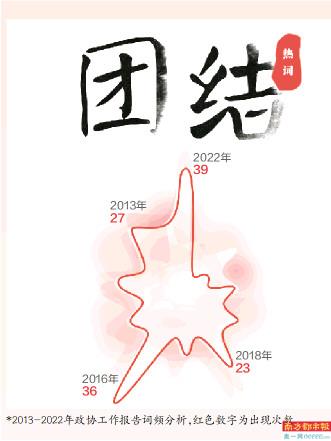 南都大数据研究院梳理分析2013年来的政协工作报告发现,“团结”一词十年累计出现219次,在今年报告中出现39次,为历史最高频次。今年报告首次用专章阐述“强化使命担当:为加强中华儿女大团结努力奋斗”。报告提到,加强中华儿女大团结是新时代人民政协的历史责任。人民政协因团结而生、依团结而存、靠团结而兴,在不同历史时期为促进中华儿女大团结作出了重要贡献。当前,世界百年未有之大变局加速演进,当代中国正经历人类历史上最为宏大而独特的实践创新,改革发展稳定任务之重、矛盾风险挑战之多、治国理政考验之大前所未有,更加需要加强中华儿女大团结。