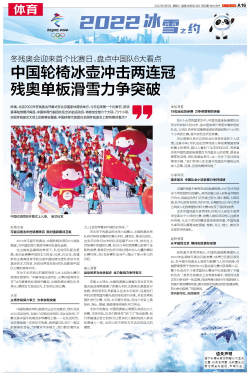 昨晚,北京2022年冬残奥会开幕式在北京国家体育场举行,今日迎来第一个比赛日,各项赛事陆续展开角逐,中国体育代表团共派出96名运动员,将参加全部六个大项、73个小项,实现冬残奥会大项上的参赛全覆盖