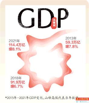 2021年,我国国内生产总值(GDP)比上年增长8.1%,在全球主要经济体中名列前茅;经济规模达到114.4万亿元,稳居全球第二大经济体;人均GDP达到80976元,按年平均汇率折算达12551美元,超过世界人均GDP水平。