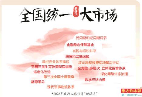 南都记者对报告内2022年政府工作任务梳理发现,今年至少有10多个新提法出现,涉及经济、市场、创新、消费、农业、环境、民生等多领域。譬如,报告提到,今年经济社会发展任务重、挑战多。立足构建新发展格局,报告提出“加快建设全国统一大市场”。再如,报告指出,稳定宏观经济大盘,强化“跨周期和逆周期调节”。