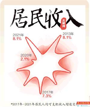 2021年,全国居民人均可支配收入35128元,比上年实际增长8.1%,与GDP增速同步。