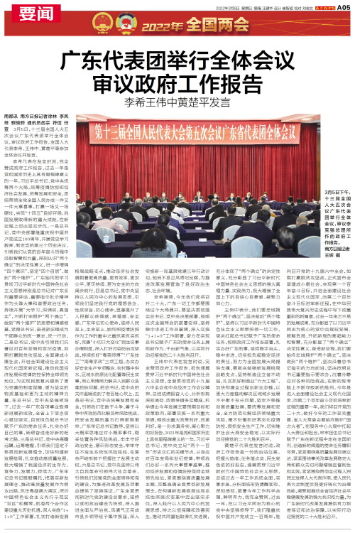南都讯 南方日报记者徐林 李凤祥 骆骁骅 通讯员岳宗 符信 任宣 3月5日,十三届全国人大五次会议广东代表团举行全体会议,审议政府工作报告。全国人大代表李希、王伟中、黄楚平等参加全体会议并发言。