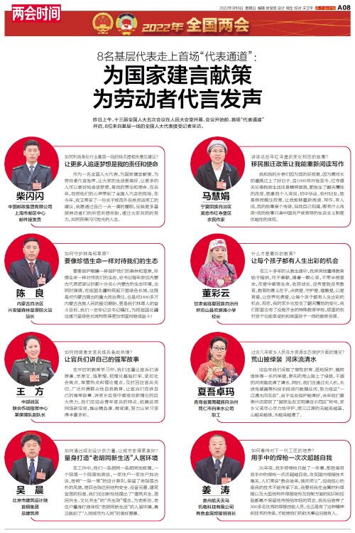 昨日上午,十三届全国人大五次会议在人民大会堂开幕,会议开始前,首场“代表通道”开启,8位来自基层一线的全国人大代表接受记者采访。 如何利用身处行业基层一线的特点提相关意见建议? 让更多人追逐梦