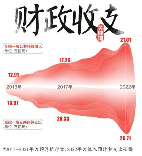 今年的财政预算报告强调,2022年积极的财政政策要提升效能,更加注重精准、可持续。围绕这个要求,《关于2021年中央和地方预算执行情况与2022年中央和地方预算草案的报告》(以下简称《报告》),对2022年财政收入和支出做出什么安排?资金投向的重点有哪些?南都大数据研究院梳理近10年财政预算报告关键数,一起来了解“国家账本”。