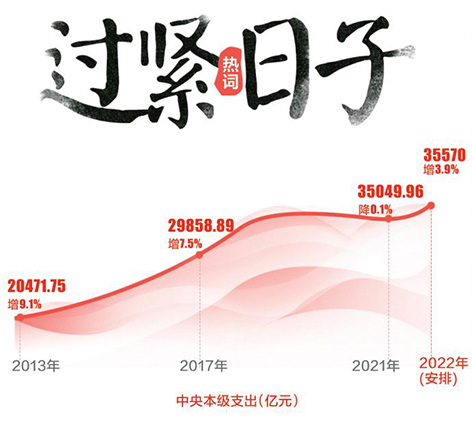 继2020年、2021年连续两年负增长后,2022年中央本级支出安排35570亿元,增长3.9%。