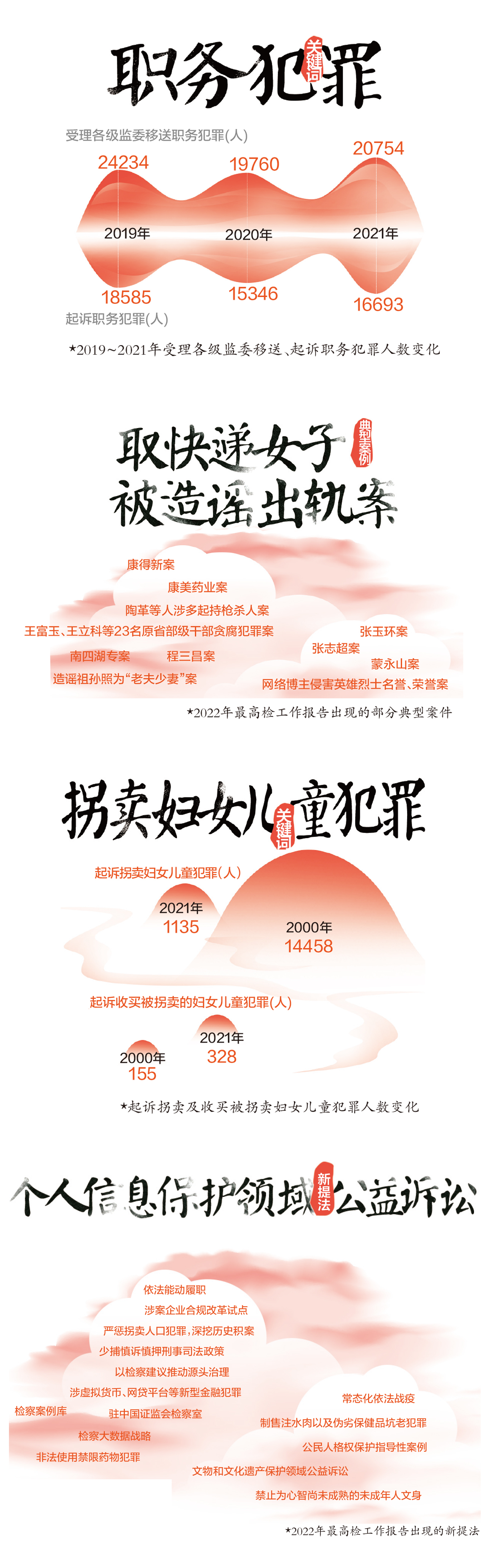 今年的最高检工作报告中,有10多个新提法亮相,将“与时俱进”渗透进检察工作的每一个环节。譬如,拓展公益诉讼案件范围,首提“个人信息保护领域公益诉讼”,2021年共办理相关公益诉讼2000余件;今年来,拐卖人口犯罪备受关注,报告特别指出“严惩拐卖人口犯罪,深挖历史积案”;此外,报告还点出不少新型犯罪,包括制售注水肉以及伪劣保健品坑老犯罪、非法使用禁限药物犯罪、涉虚拟货币、网贷平台新型金融犯罪等。