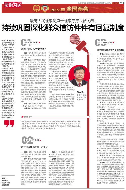 一直以来,信访都是群众急难愁盼的问题。为了回应广大群众的现实需求,维护其合法权益,化解信访矛盾,最高检要求各级检察机关采取“件件有回复”、公开听证和院领导包案办理信访案件等措施。 数据显示,去年