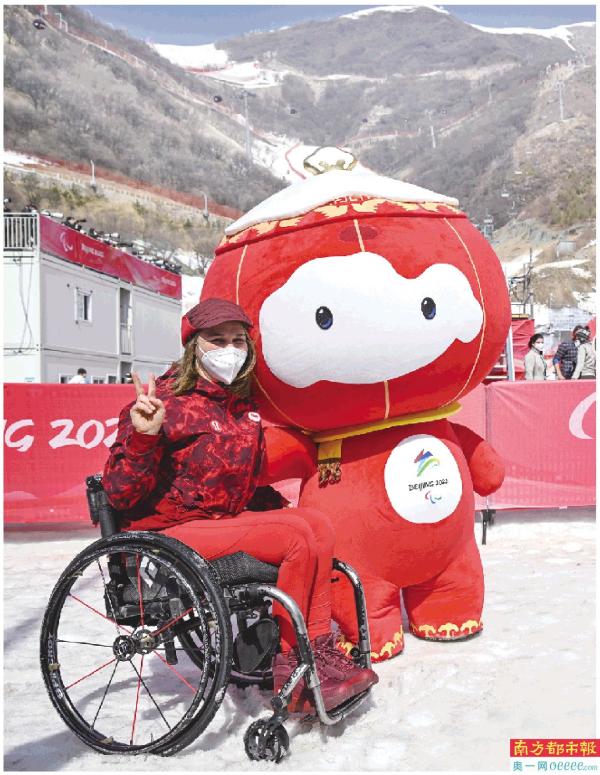 3月10日,在延庆国家高山滑雪中心,“雪容融”和一名运动员合影。 新华社发